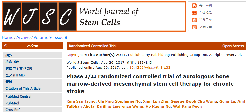 2017年,Tsang等的自體骨髓間充質(zhì)干細(xì)胞療法治療慢性卒中的I/II期隨機(jī)對照試驗(yàn)顯示,自體骨髓MSC移植相比安慰劑改善了神經(jīng)功能恢復(fù)。