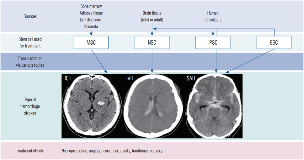 圖3:用于治療ICH的干細(xì)胞類型:該圖顯示了用于治療ICH(腦實(shí)質(zhì)出血、腦室內(nèi)出血[IVH]和蛛網(wǎng)膜下腔出血[SAH])的干細(xì)胞類型,包括 NSC、間充質(zhì)干細(xì)胞 (MSC)、誘導(dǎo)多能干細(xì)胞 (iPSC) 和胚胎干細(xì)胞 (ESC)。