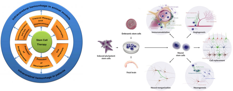 圖2:干細(xì)胞和NSC在ICH中的治療機(jī)制:闡明了其保護(hù)作用,包括修復(fù)、替代、神經(jīng)營養(yǎng)支持、抗凋亡、抗炎、血管再生、神經(jīng)發(fā)生、免疫調(diào)節(jié)、神經(jīng)修復(fù)、分化為星形膠質(zhì)細(xì)胞/神經(jīng)元/少突膠質(zhì)細(xì)胞以及宿主組織整合——最終增強(qiáng)組織修復(fù)和神經(jīng)功能恢復(fù)。