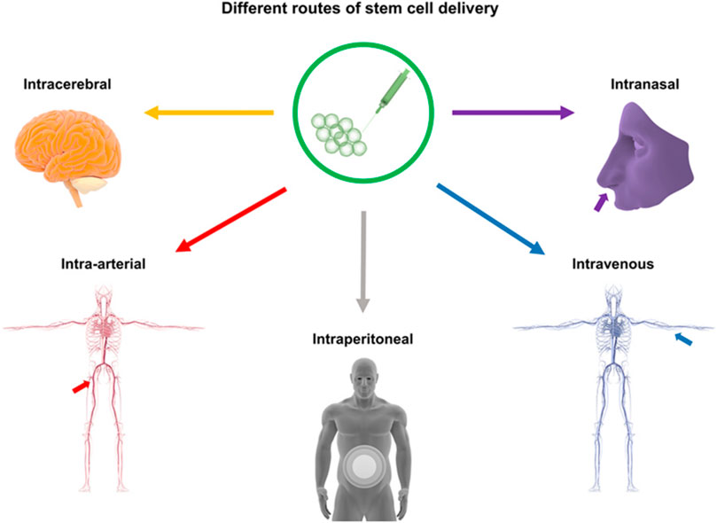 圖1:干細(xì)胞移植途徑:該圖展示了用于中風(fēng)治療的干細(xì)胞輸送途徑,包括腦內(nèi)(立體定向注射)、血管內(nèi)(靜脈/動脈)、腹腔內(nèi)、腦室內(nèi)、靜脈內(nèi)、鼻內(nèi)和鞘內(nèi)注射方法。