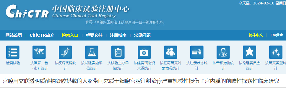 據(jù)悉,該項研究注冊號為ChiCTR2400080588,注冊日期為2024年2月1日,旨在評估宮腔用交聯(lián)透明質酸鈉凝膠搭載的人臍帶間充質干細胞宮腔移植治療對中重度宮腔粘連及薄型內膜患者的有效性和安全性。