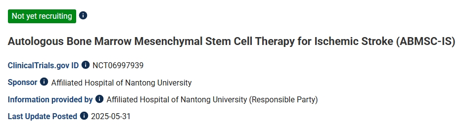 5月31日–南通大學(xué)附屬醫(yī)院已啟動(dòng)自體骨髓間充質(zhì)干細(xì)胞移植用于缺血性腦卒中精準(zhǔn)治療的干預(yù)性臨床試驗(yàn)(1、2期)[1]。