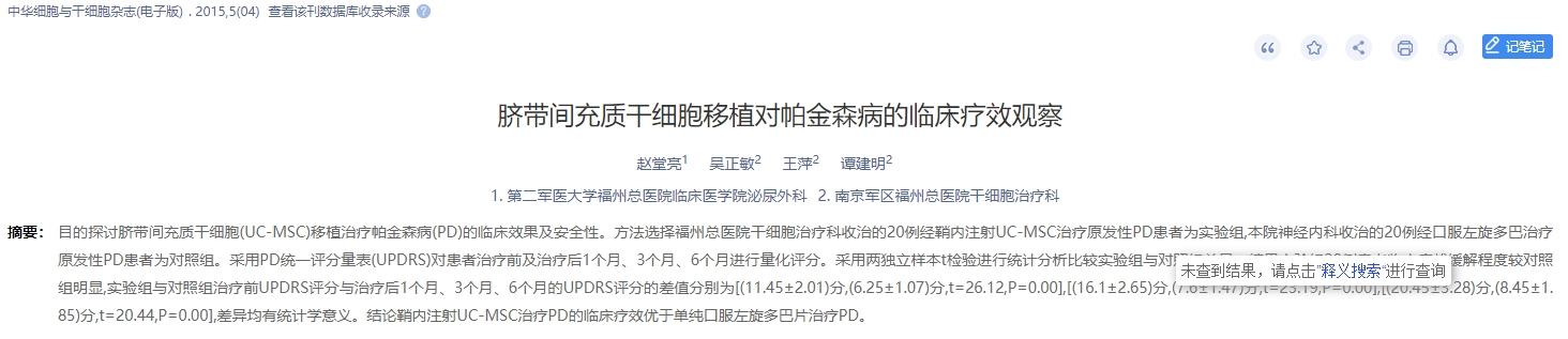 2015年,第二軍醫(yī)大學(xué)福州總醫(yī)院發(fā)表了一篇臍帶間充質(zhì)干細(xì)胞移植對(duì)帕金森病的臨床療效觀察的文章。