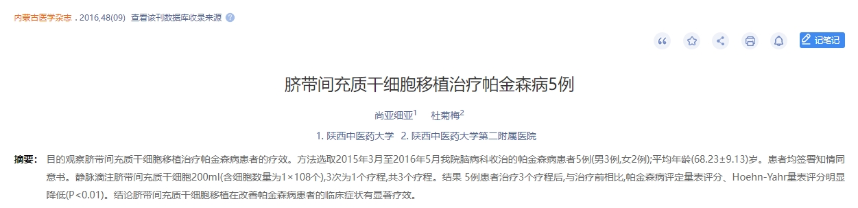2016年,陜西中醫(yī)藥大學(xué)發(fā)表一篇臍帶間充質(zhì)干細(xì)胞移植治療帕金森病5例的文章。