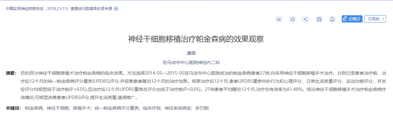 2018年,河南駐馬店市中心醫(yī)院神經(jīng)內(nèi)二科發(fā)表了神經(jīng)干細(xì)胞移植治療帕金森病的效果觀察的文章。