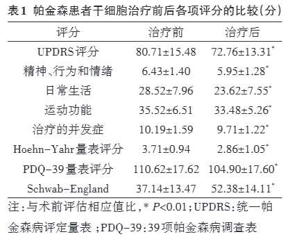 MDS-UPDRS:21例患者均成功移植,出院后隨訪6~49月,平均24.9月。與術(shù)前基線水平相比,21例患者UPDRS評(píng)分、Hoehn-Yahr評(píng)分、PDO-39評(píng)分明顯降低。UPDRS四個(gè)分項(xiàng),即精神、行為和情緒、日常生活運(yùn)動(dòng)功能和治療的并發(fā)癥等評(píng)分也都明顯降低。