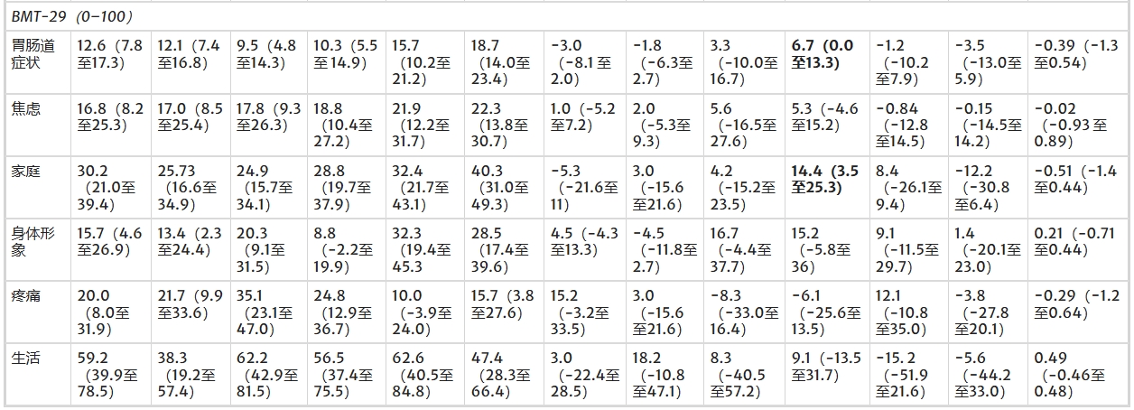 小結(jié):在次要患者結(jié)局方面,實(shí)驗(yàn)組在生活質(zhì)量的 “身體功能” 和 “角色功能” 子量表上顯著優(yōu)于對照組,且在體重、認(rèn)知、社會功能等多項(xiàng)指標(biāo)上呈現(xiàn)中到大效應(yīng)的改善趨勢,盡管部分指標(biāo)(如呼吸困難、胃腸道癥狀)未達(dá)統(tǒng)計學(xué)顯著。但實(shí)驗(yàn)組在體力活動和營養(yǎng)攝入達(dá)標(biāo)率上與對照組無差異,約17%的參與者存在鈣缺乏。健康服務(wù)結(jié)局顯示,兩組干細(xì)胞植入時間無顯著差異,提示干預(yù)措施未對治療流程關(guān)鍵時間節(jié)點(diǎn)產(chǎn)生影響。