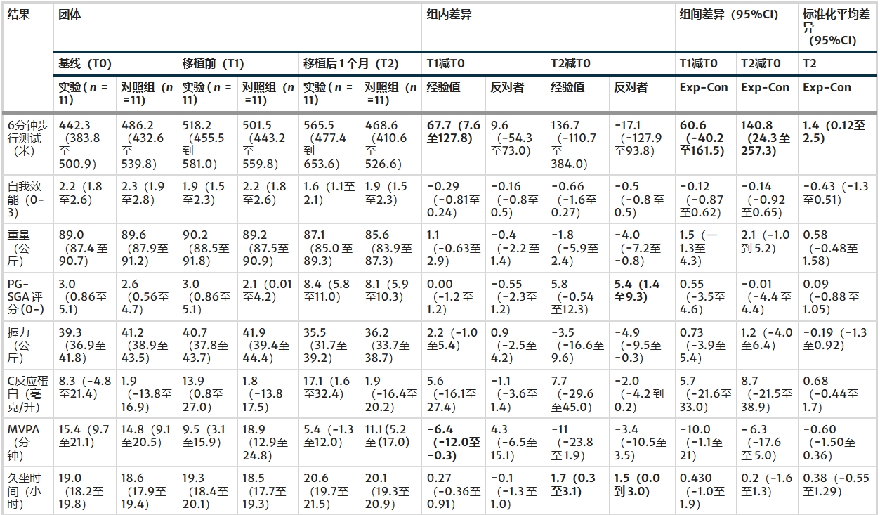 總結(jié):研究顯示預(yù)康復(fù)安全性良好,僅出現(xiàn)輕微不良事件(如皮膚刺激、肌肉酸痛),自體干細(xì)胞移植后常見并發(fā)癥為腹瀉和發(fā)熱性中性粒細(xì)胞減少,5 例患者病情進(jìn)展或復(fù)發(fā)。主要療效指標(biāo)(6分鐘步行距離)表明,實(shí)驗(yàn)組較對照組有顯著改善,效應(yīng)量超過臨床意義閾值,提示干預(yù)措施對患者運(yùn)動能力有積極影響。