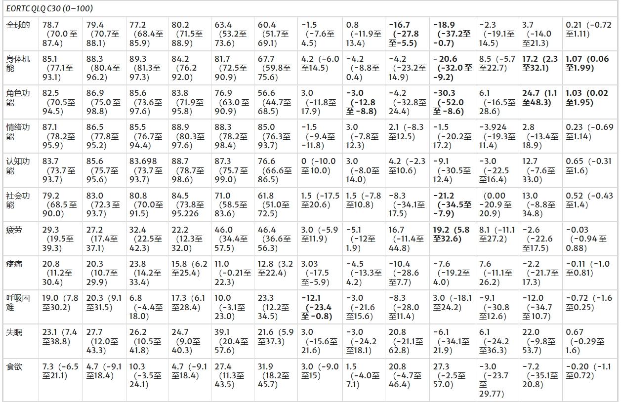 在T2期,實(shí)驗(yàn)組在EORTC-QLQ C30量表的身體功能和角色功能子量表上顯示出顯著優(yōu)于對照組的組間差異。其他次要結(jié)局未達(dá)到統(tǒng)計學(xué)顯著。然而,T2期實(shí)驗(yàn)組在以下方面表現(xiàn)出中到大效應(yīng)優(yōu)勢:體重增加、認(rèn)知功能改善、社會功能、區(qū)分生活中重要事項(xiàng)的能力,以及呼吸困難減輕和胃腸道癥狀緩解。