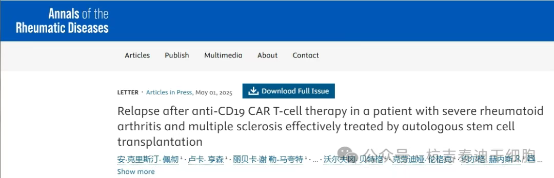 近期,國際著名期刊雜志“Annals of the Rheumatic Diseases”報道了一項“Relapse after anti-CD19 CAR T-cell therapy in a patient with severe rheumatoid arthritis and multiple sclerosis effectively treated by autologous stem cell transplantation”(一名嚴(yán)重類風(fēng)濕性關(guān)節(jié)炎多發(fā)性硬化癥患者接受抗CD19 CAR-T細(xì)胞治療后復(fù)發(fā),經(jīng)過自體干細(xì)胞移植后安全有效)的研究報道[1]。