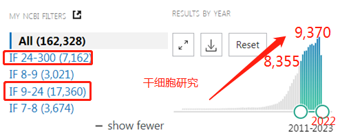到2022年11月23日,干細(xì)胞研究領(lǐng)域已經(jīng)發(fā)表了42萬篇PubMed收錄的論文,其中近10年就發(fā)表了23萬篇。干細(xì)胞研究成果15.1%發(fā)表在9分+期刊,4.4%發(fā)表在24分以上期刊。