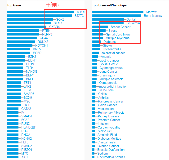 如下圖所示, 白血病、乳腺癌、脊髓損傷、多發(fā)性骨髓瘤、糖尿病等是干細(xì)胞研究中最關(guān)注的疾病。其他疾病還包括中風(fēng)、骨關(guān)節(jié)炎、大腸癌、貧血、胃癌、SARS-CoV-2、肺癌、腦損傷、多發(fā)性硬化癥、骨質(zhì)疏松癥等。
