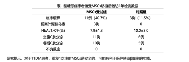通過這個數(shù)據(jù)可以看出,通過間充質(zhì)干細(xì)胞治療的27例患者中,3例患者是脫離了外源胰島素,也就是說自身已經(jīng)可以開始分泌胰島素了。這是過往傳統(tǒng)的治療方法所無法做到的。11例患者得到緩解,也就是外源胰島素用量降低。而剩下的13例,則沒有太大變化。這很有可能是干細(xì)胞被其他組織器官“拐走了”。