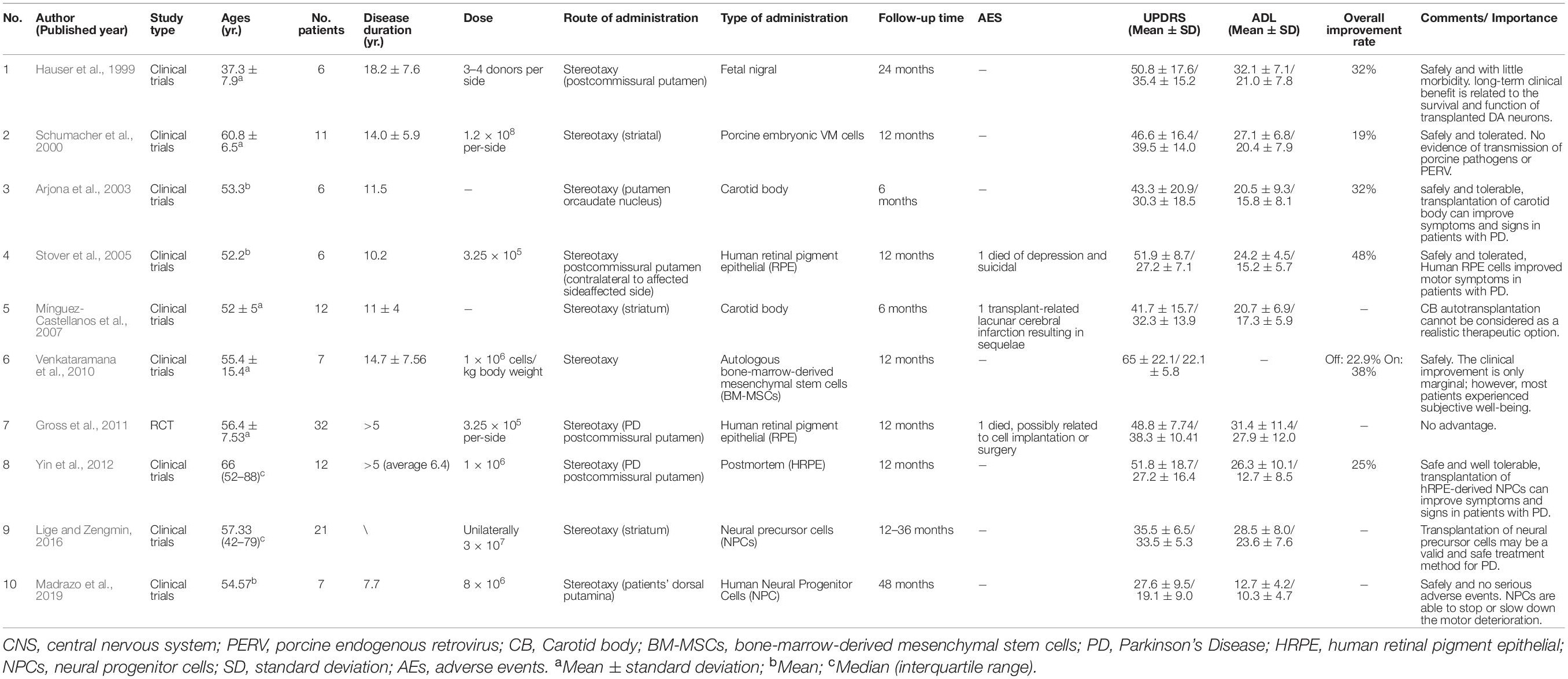 主要結(jié)果:表1顯示了最終文獻(xiàn)綜述中包含的文章的特征。這10項(xiàng)納入的研究是在1999年至2019年期間進(jìn)行的,包括120名接受細(xì)胞療法的帕金森病患者。涉及五種類型的細(xì)胞療法,包括人類胎兒、豬胚胎、BM-MSCs、HRPE和NPC。所有研究均采用立體定向移植。七項(xiàng)研究報(bào)告了UPDRSIII的顯著改善,2項(xiàng)研究顯示結(jié)果不佳。安全性方面,7篇報(bào)道細(xì)胞移植安全且耐受性好,3篇報(bào)道細(xì)胞移植相關(guān)并發(fā)癥,包括抑郁自殺傾向、細(xì)胞移植相關(guān)腦梗死(有后遺癥)、細(xì)胞移植手術(shù)相關(guān)并發(fā)癥死亡(表1)。