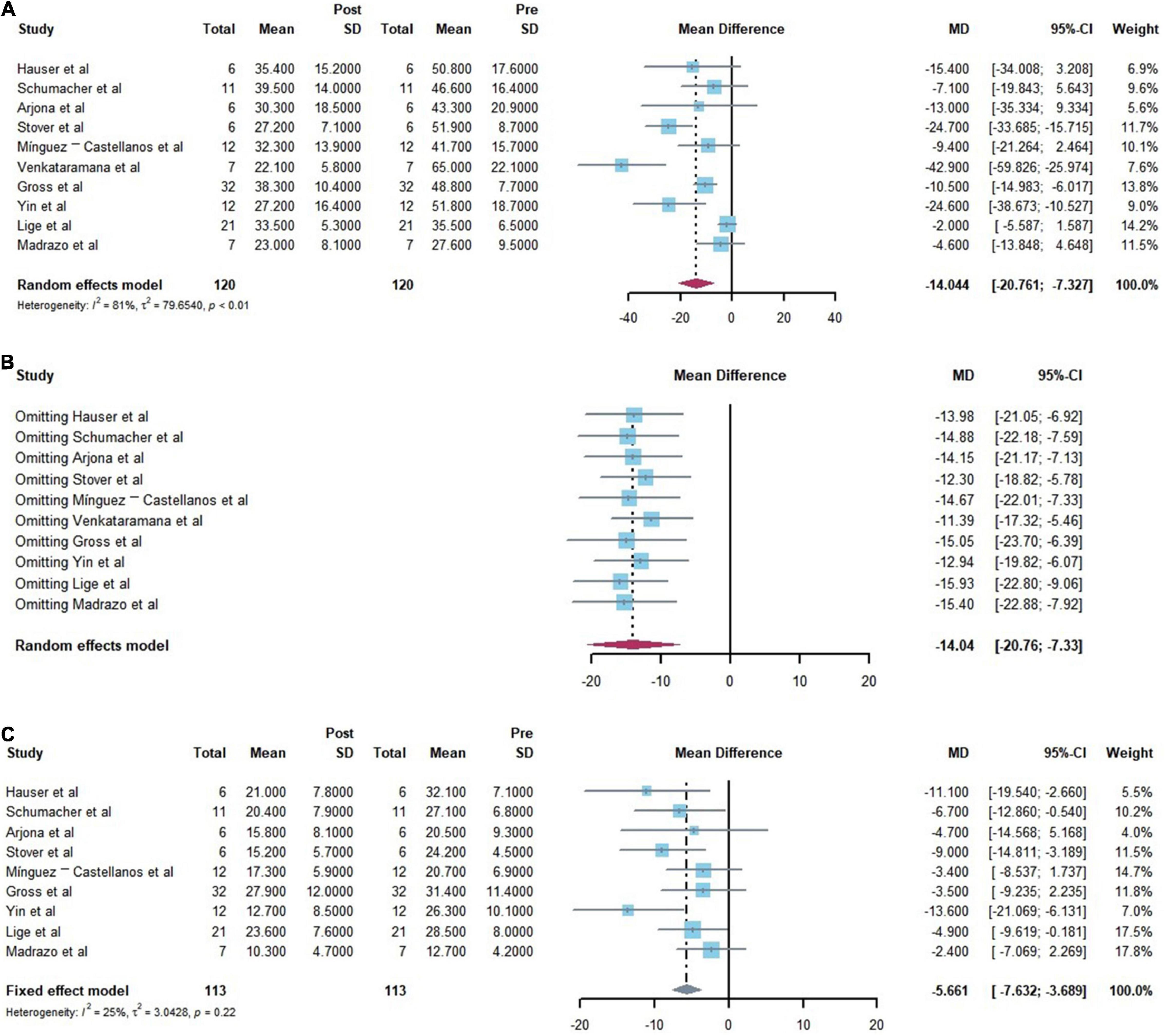(A)統(tǒng)一帕金森病評(píng)定量表 (UPDRS) III運(yùn)動(dòng)功能主要結(jié)果分析的森林圖。