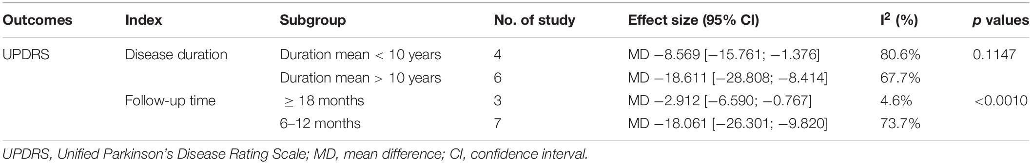 基于不同隨訪時(shí)間的結(jié)果:隨訪=6–12個(gè)月 -18.061(95%CI:-26.301;-9.820)I2=73.7%;隨訪>18個(gè)月-2.912(95% CI:-6.590;0.767)I2= 4.6%,(亞組差異檢驗(yàn):P< 0.001)。值得注意的是,亞組的異質(zhì)性降低了,表明這些因素是潛在的異質(zhì)性來(lái)源。更具體地說(shuō),最好的改善是在術(shù)后近1年時(shí)實(shí)現(xiàn)的(表2)。