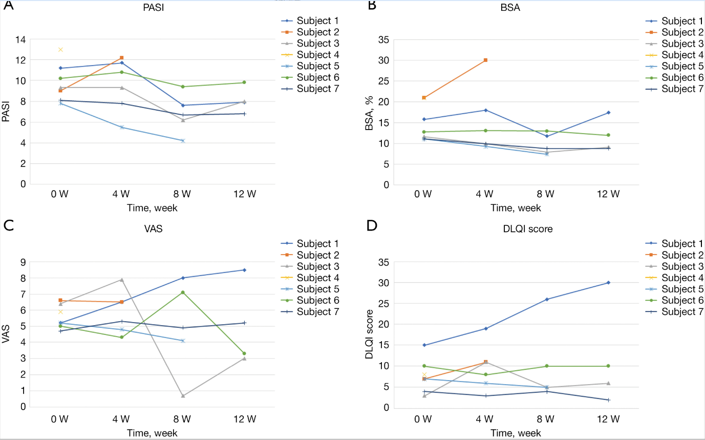 PASI評(píng)分從基線到第12周的改善率范圍為-0.36%至46%。圖2顯示了7名參與者的一些結(jié)果測(cè)量值。PASI 分?jǐn)?shù)從基線到第12周逐漸下降(圖2A)。然而,在基線和第12周之間,PASI、BSA、VAS 和DLQI評(píng)分沒(méi)有統(tǒng)計(jì)學(xué)上的顯著差異(參見(jiàn)圖2B-2D)。在試驗(yàn)過(guò)程中,沒(méi)有參與者達(dá)到PASI-50或PASI-75。