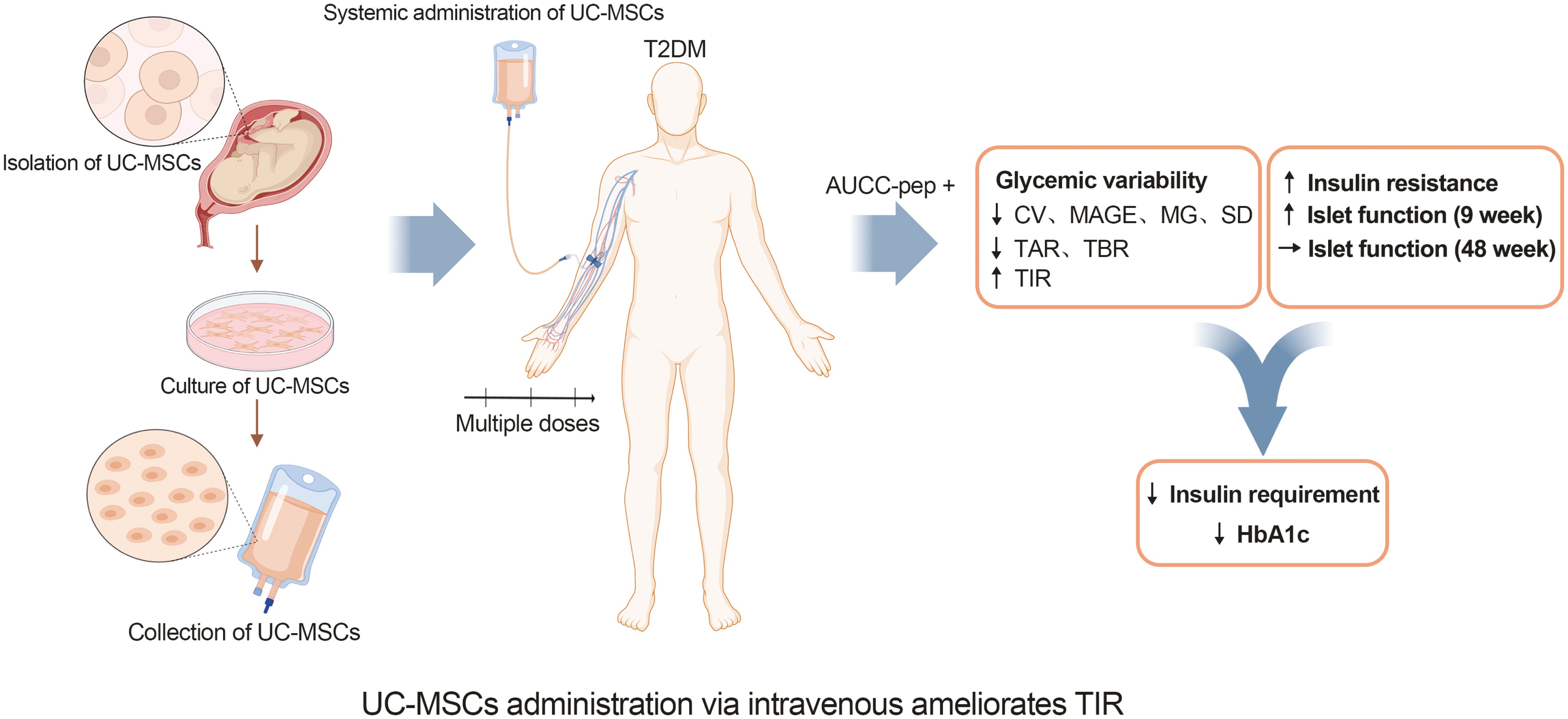 這項(xiàng)前瞻性、單中心、隨機(jī)、雙盲、安慰劑對(duì)照試驗(yàn)表明,在肘關(guān)節(jié)靜脈輸注UC-MSC可以增加TIR,減輕血糖變異性,降低HbA1c水平,減少每日胰島素需要量,改善胰島β-細(xì)胞功能并改善胰島素抵抗。AUCC-pep是與接受UC-MSC干預(yù)的T2D療效相關(guān)的獨(dú)立危險(xiǎn)因素,男性患者更有可能從UC-MSC治療中受益。沒(méi)有發(fā)生與UC-MSC移植相關(guān)的重大不良事件。