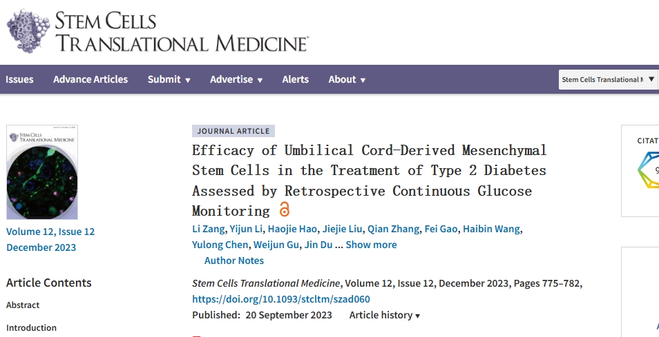 2023年,解放軍總醫(yī)院第一醫(yī)學中心在權威期刊雜志《干細胞轉化醫(yī)學》發(fā)表了一篇有關過回顧性連續(xù)血糖監(jiān)測評估臍帶間充質(zhì)干細胞治療2型糖尿病的療效”的臨床研究文章[1]