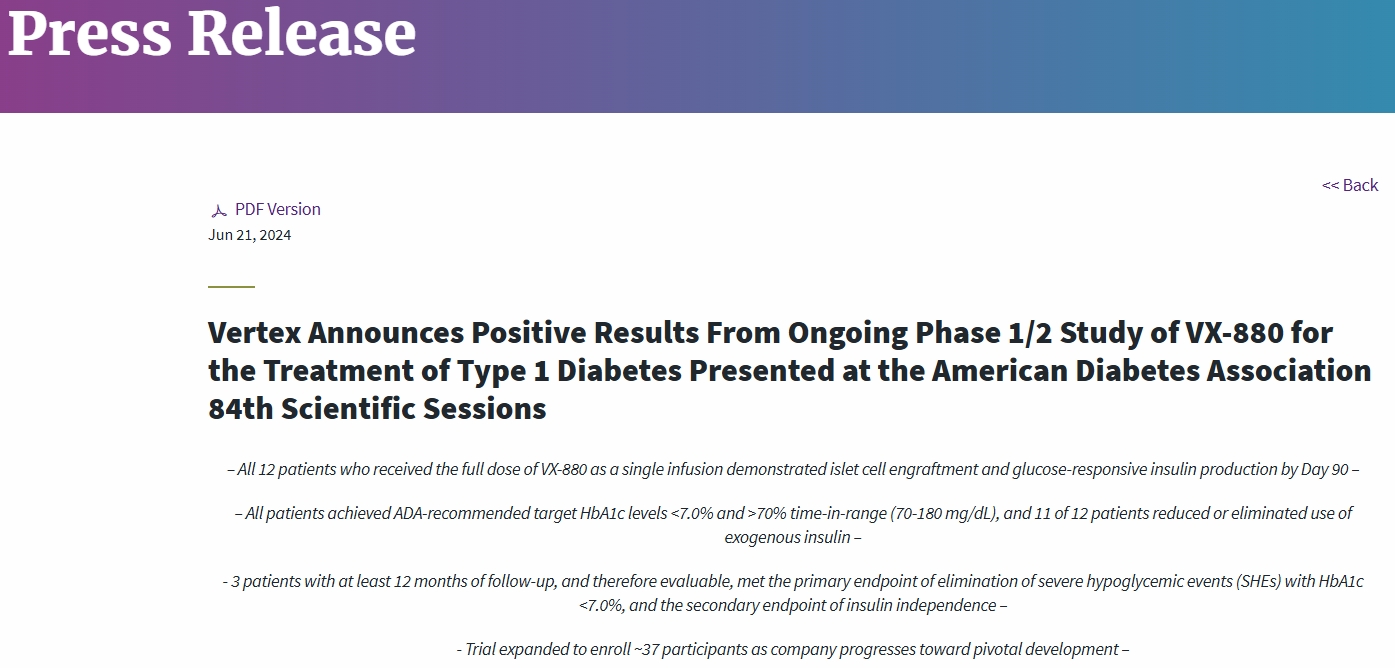 2024年6月,Vertex宣布正在進(jìn)行的VX-880治療1型糖尿病的1/2期研究取得積極成果,并在美國糖尿病協(xié)會第84屆科學(xué)會議上發(fā)表。