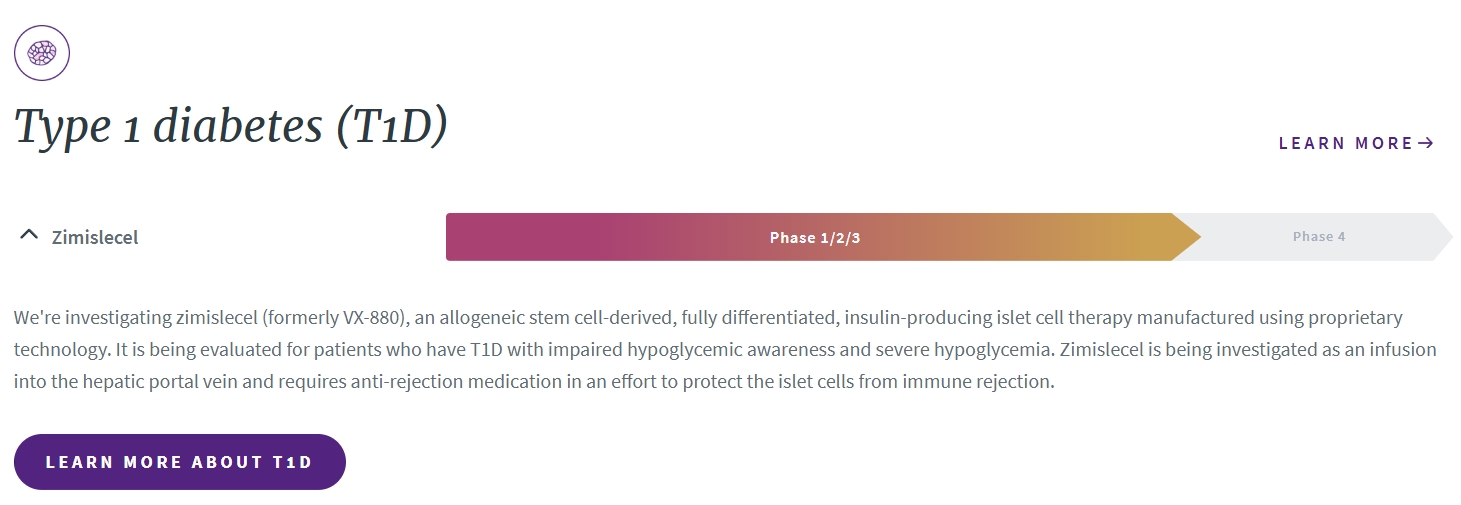Zimislecel(原名VX-880)是Vertex公司在研的全分化胰島細(xì)胞療法,聯(lián)合標(biāo)準(zhǔn)免疫抑制療法,目前正處于一項(xiàng)針對(duì)伴有嚴(yán)重低血糖事件 (SHE) 和低血糖意識(shí)受損的1型糖尿病 (T1D) 患者的1/2/3期臨床研究的3期階段。這項(xiàng)關(guān)鍵性試驗(yàn)進(jìn)展順利,預(yù)計(jì)將于2025年上半年完成患者入組和給藥,并于2026年提交全球監(jiān)管機(jī)構(gòu)。