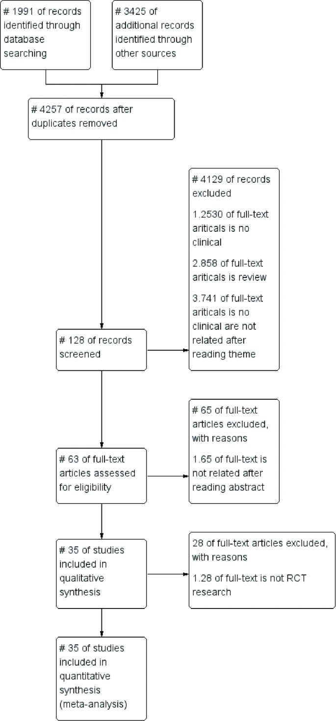 流程圖概述:通過系統(tǒng)檢索PubMed(1991篇)、Embase及Cochrane數(shù)據(jù)庫(共3425篇),初步納入5416篇文獻(xiàn),經(jīng)去重后剩余4257篇。按排除標(biāo)準(zhǔn)分步篩選:排除2530篇非臨床研究(如基礎(chǔ)實(shí)驗(yàn)、動(dòng)物研究)、858篇綜述、741篇摘要不相關(guān)文獻(xiàn)、65篇全文不相關(guān)文獻(xiàn)及28篇不符合RCT設(shè)計(jì)的文獻(xiàn),最終納入35項(xiàng)研究進(jìn)行薈萃分析(圖1)。