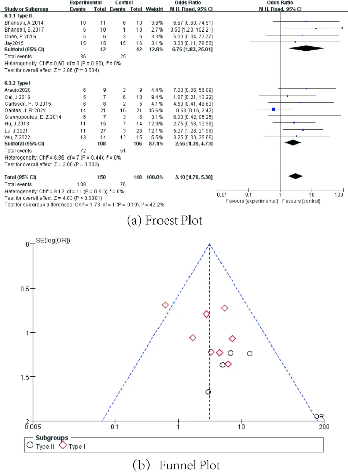 本研究通過薈萃分析評(píng)估間充質(zhì)干細(xì)胞治療1型糖尿病與2型糖尿病的療效差異?;?2項(xiàng)研究(8項(xiàng)I型、4項(xiàng)II型)的二分類數(shù)據(jù),固定效應(yīng)模型顯示MSCs對(duì)兩類糖尿病均具有顯著療效,且置信區(qū)間未跨越無效值。分層分析表明,II型糖尿病的效應(yīng)值(6.76)顯著高于I型(2.56),表明MSCs在治療II型糖尿病方面更有效。這些數(shù)據(jù)為糖尿病提供了新的見解,其中MSCs是治療II型糖尿病最有效的方法。