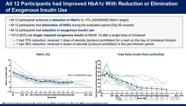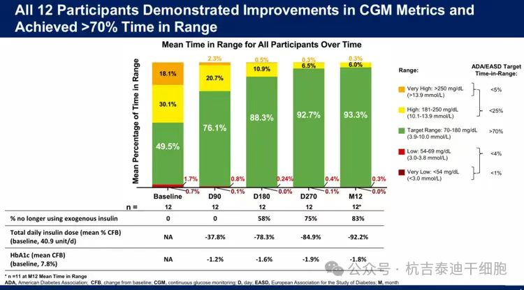 在針對嚴(yán)重1型糖尿病伴低血糖無知覺患者的試驗中,83%(10/12)的患者一年內(nèi)完全停用胰島素,所有患者HbA1c降至正常(<7%)、血糖達標(biāo)時間(TIR)超93%,且嚴(yán)重低血糖事件從第90天起清零,首次實現(xiàn)接近“功能性治愈”的療效。
