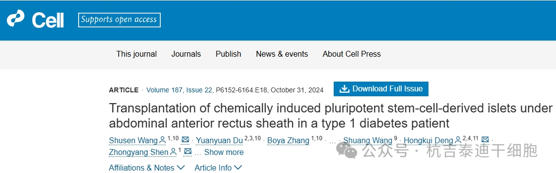 2.Wang S, Du Y, Zhang B, Meng G, Liu Z, Liew SY, Liang R, Zhang Z, Cai X, Wu S, Gao W, Zhuang D, Zou J, Huang H, Wang M, Wang X, Wang X, Liang T, Liu T, Gu J, Liu N, Wei Y, Ding X, Pu Y, Zhan Y, Luo Y, Sun P, Xie S, Yang J, Weng Y, Zhou C, Wang Z, Wang S, Deng H, Shen Z. Transplantation of chemically induced pluripotent stem-cell-derived islets under abdominal anterior rectus sheath in a type 1 diabetes patient. Cell. 2024;187:6152–6164.e18. doi: 10.1016/j.cell.2024.09.004. [DOI] [PubMed] [Google Scholar]
