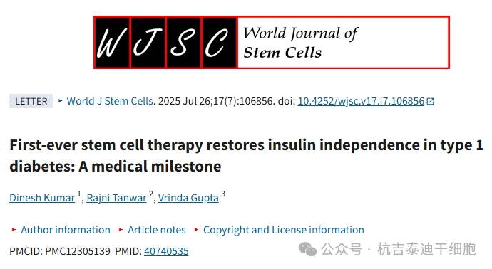 2025年7月26號,知名醫(yī)學(xué)期刊雜志《World J Stem Cells》刊發(fā)了一篇“干細(xì)胞療法首次實(shí)現(xiàn)了1型糖尿病患者的胰島素獨(dú)立:醫(yī)學(xué)里程碑”的文獻(xiàn)綜述。