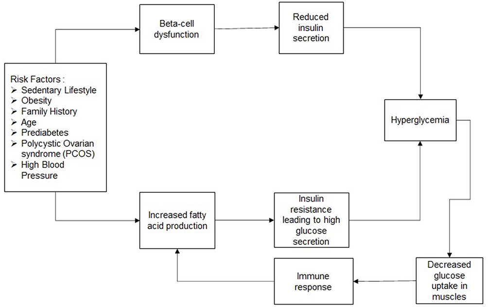 T2DM:如上所述,T2DM歸因于多種風(fēng)險(xiǎn)因素。這些因素會(huì)在一段時(shí)間內(nèi)導(dǎo)致β細(xì)胞功能障礙。β細(xì)胞的低容量或功能障礙會(huì)減少胰腺的胰島素分泌,進(jìn)而導(dǎo)致高血糖癥。這些風(fēng)險(xiǎn)因素還會(huì)導(dǎo)致肝臟產(chǎn)生更多的脂肪酸,從而導(dǎo)致肝臟中形成大量葡萄糖分泌物。葡萄糖分泌增加會(huì)降低胰島素的功能并導(dǎo)致胰島素抵抗。高血糖導(dǎo)致肌肉吸收的葡萄糖量低,并引起免疫反應(yīng)。這會(huì)進(jìn)一步損害肝臟并增加胰島素抵抗。