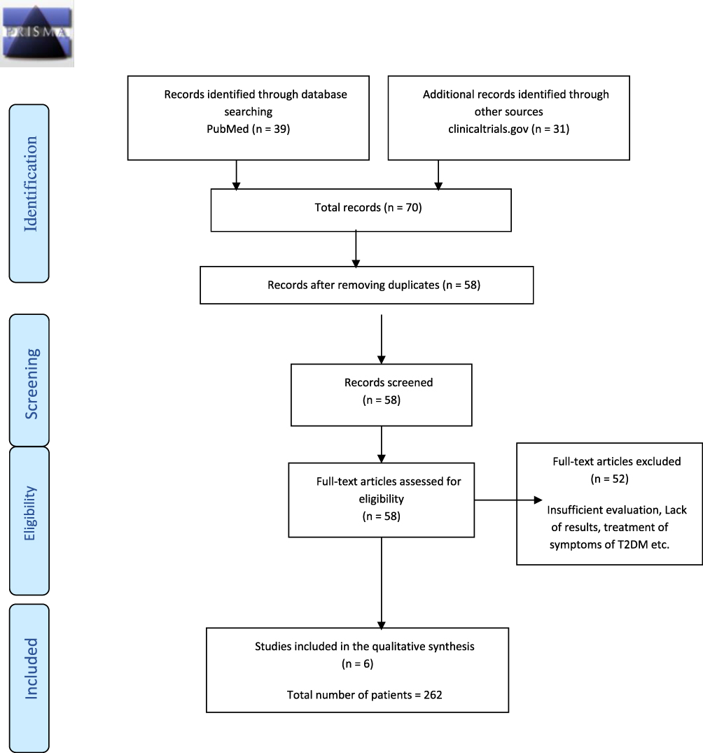 總共收集了70個(gè)試驗(yàn);檢查重復(fù)記錄后只剩下58人。在58項(xiàng)臨床試驗(yàn)中,僅包括六項(xiàng)研究(T1、T2、T3、T4、T5、T6)(表1)。其余的需要更全面的結(jié)果,關(guān)于治療評(píng)估方法的信息不足,旨在報(bào)告與T2DM相關(guān)的長(zhǎng)期合并癥而不是疾病的治療,非隨機(jī)化,參與者有其他病態(tài)。薈萃分析中包含的研究均使用自體 MSCs注射,無(wú)論其來(lái)源如何。