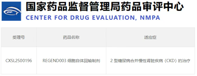 2025年5月,據(jù)國家藥品監(jiān)督管理局藥品審評中心官網(wǎng)公布一款名為“REGEND003”的腎干細胞自體回輸制劑近日獲得了《藥物臨床試驗批準通知書》的新藥注冊臨床試驗I/II期申請(受理號:CXSL2500196),用于治療2型糖尿病合并慢性腎臟疾病(CKD)。