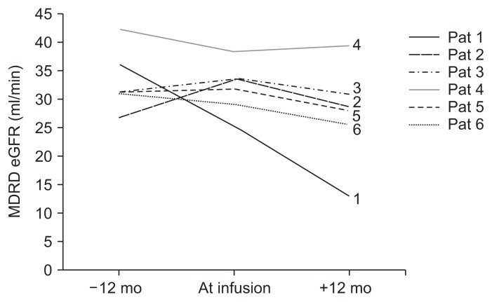總體而言,通過血漿肌酐水平和MDRD eGFR評估的腎功能在MSC輸注后12個月時有所下降,盡管這種下降沒有統(tǒng)計學(xué)意義 ( P=0.065)。除患者4外,所有病例的eGFR均略有下降,范圍為7.5%至49.0%。