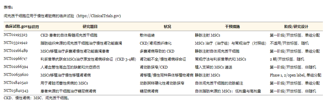 目前很少有臨床試驗調(diào)查間充質(zhì)干細胞在治療各種類型慢性腎病患者中的安全性和治療潛力。大多數(shù)試驗都是I期或II期研究,在患者數(shù)量和研究設計方面都有局限性(表1)。