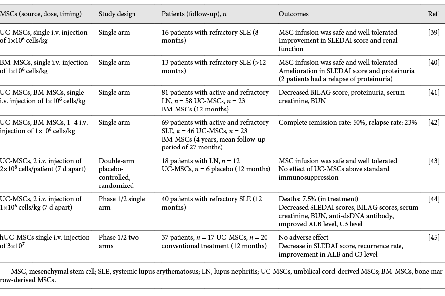 間充質(zhì)干細胞治療的第一個I期試驗由Lazarus等人進行證明了在15名患者志愿者中進行離體培養(yǎng)擴增和靜脈輸注自體BM-MSC的安全性。從那時起,作為一種預(yù)防或治療造血干細胞移植后移植物抗宿主病的新工具,MSC 治療免疫疾病的報道不斷被報道?;趶腗SCs治療狼瘡易發(fā)小鼠的那些臨床前研究中收集的令人鼓舞的數(shù)據(jù)結(jié)果,MSC群體已經(jīng)在LN患者的臨床試驗中進行了測試(表1)。