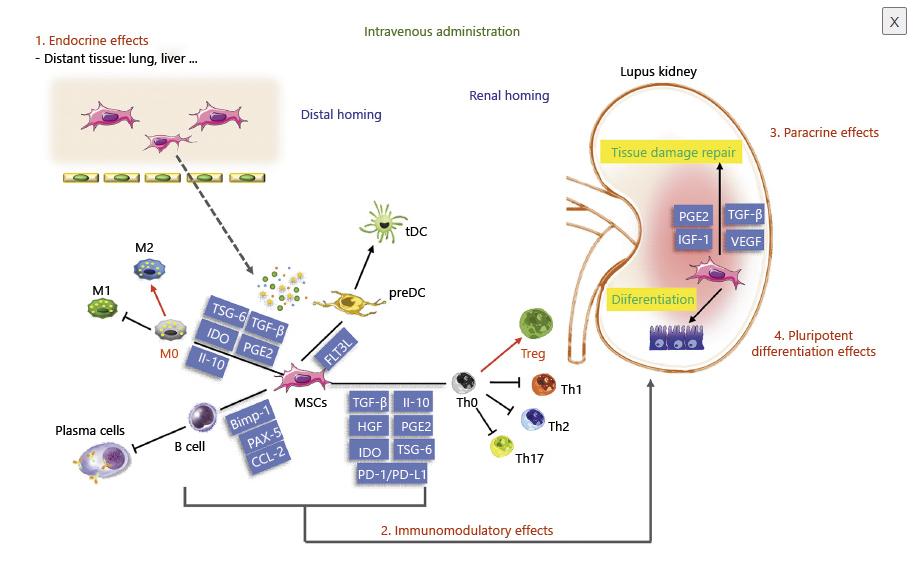 異基因間充質(zhì)干細胞治療狼瘡腎炎的機制:通過分泌多種可溶性介質(zhì),與T細胞、B細胞、巨噬細胞、DC等多種免疫細胞相互作用發(fā)揮免疫調(diào)節(jié)作用;歸巢腎臟后促進修復(fù)和再生。