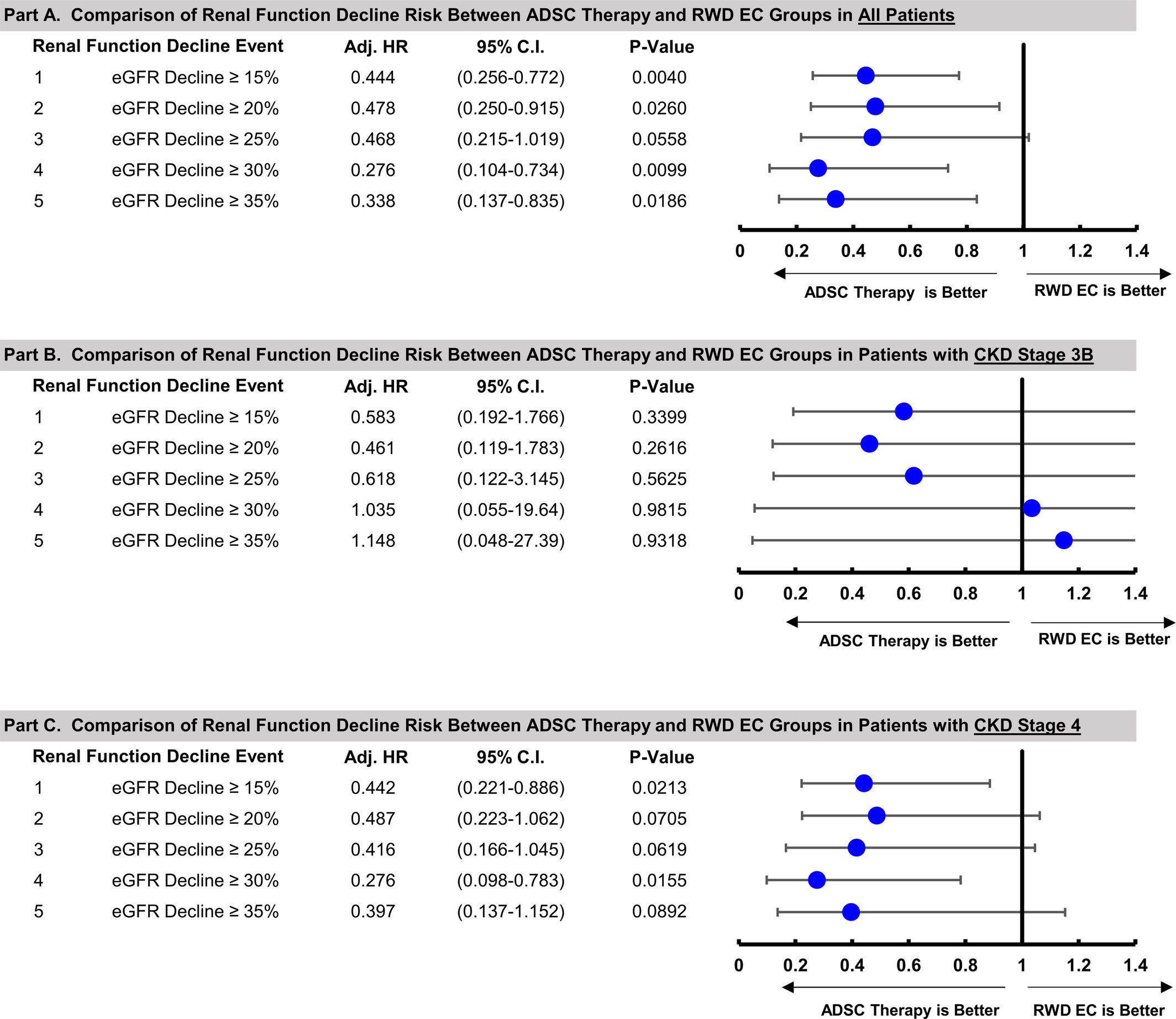 圖3:本研究比較了在所有患者以及CKD 3B期和4期患者中,ADSC治療組和RWD對照組在不同eGFR下降閾值下的腎功能下降風險。