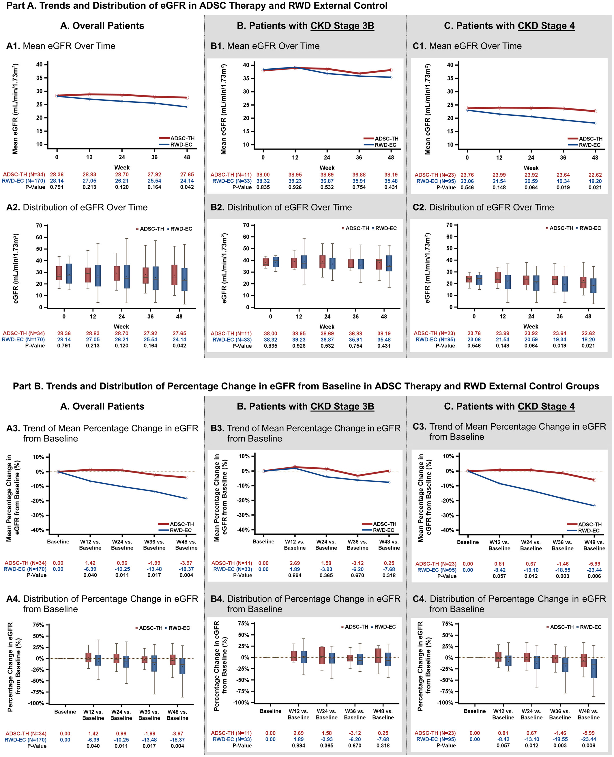 圖2:比較ADSC治療組和真實世界數(shù)據外部對照組在不同CKD分期下的eGFR趨勢和隨時間變化的百分比。