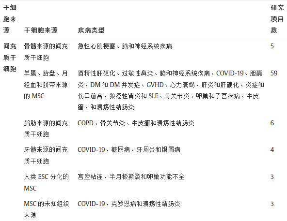 截至2021年10月,約130家三甲醫(yī)院獲國家衛(wèi)健委和國家藥監(jiān)局授權開展干細胞臨床研究。本節(jié)簡要概述了六年的搜索,迄今為止已確定了總共100個臨床研究項目。這些項目在2015年法規(guī)實施后已獲得衛(wèi)生和藥品主管部門的批準。這些臨床研究項目的總結如表1所示。