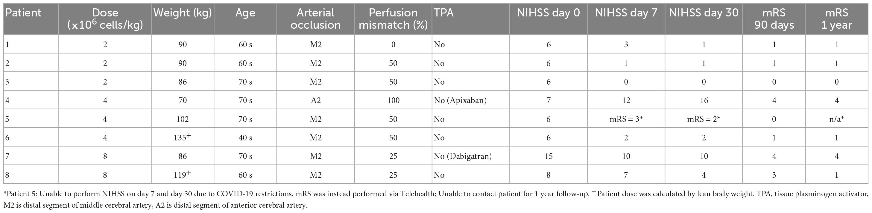 該I期試驗(yàn)的臨床方案先前已發(fā)布。我們?cè)谙旅嫣峁┝思{入和排除標(biāo)準(zhǔn)的摘要。給藥方案是根據(jù)兩名體型較大的患者(患者6和8)的去脂體重計(jì)算的。由于招募率較低,我們修改了第一階段試驗(yàn)的原始計(jì)劃,以納入接受溶栓治療的患者。這一步驟得到了我們的動(dòng)物實(shí)驗(yàn)的支持,表明hAEC與阿替普酶(手稿正在準(zhǔn)備中)聯(lián)合給藥時(shí)可提供神經(jīng)保護(hù)。當(dāng)試驗(yàn)的主要終點(diǎn)(確定安全劑量范圍和最大耐受劑量)被認(rèn)為已達(dá)到時(shí),試驗(yàn)終止,招募了8名患者。