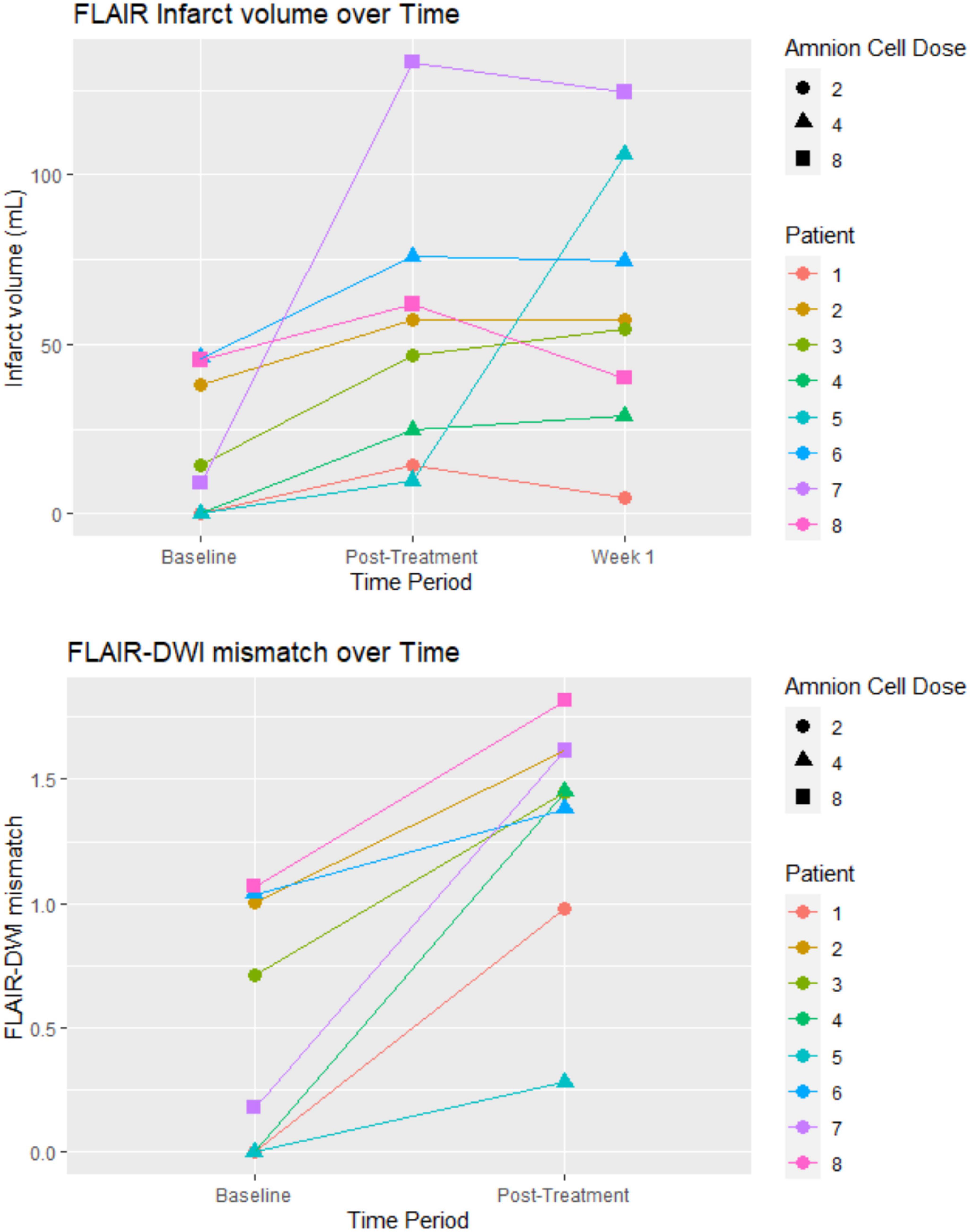 圖1說(shuō)明第一周梗塞體積的變化。細(xì)胞輸注完成后,八名患者中有七名的梗塞體積沒(méi)有明顯增加。患者4在接受hAEC后的第二天再次出現(xiàn)中風(fēng),患者7在完成hAEC輸注之前出現(xiàn)明顯的梗塞生長(zhǎng),但NIHSS沒(méi)有出現(xiàn)臨床惡化。NIHSS從入院時(shí)的15降至7天時(shí)的10(表1)?;€時(shí)FLAIR成像的中位梗塞體積為11.74ml(IQR0, 39.89)。基線DWI中位缺血體積為29.10ml(IQR6.99,42.92)。治療后的中位梗塞體積為52.05ml(UQR22.2,65.4)。1周時(shí)的中位梗塞體積為55.77ml(IQR37.26,82.28)。