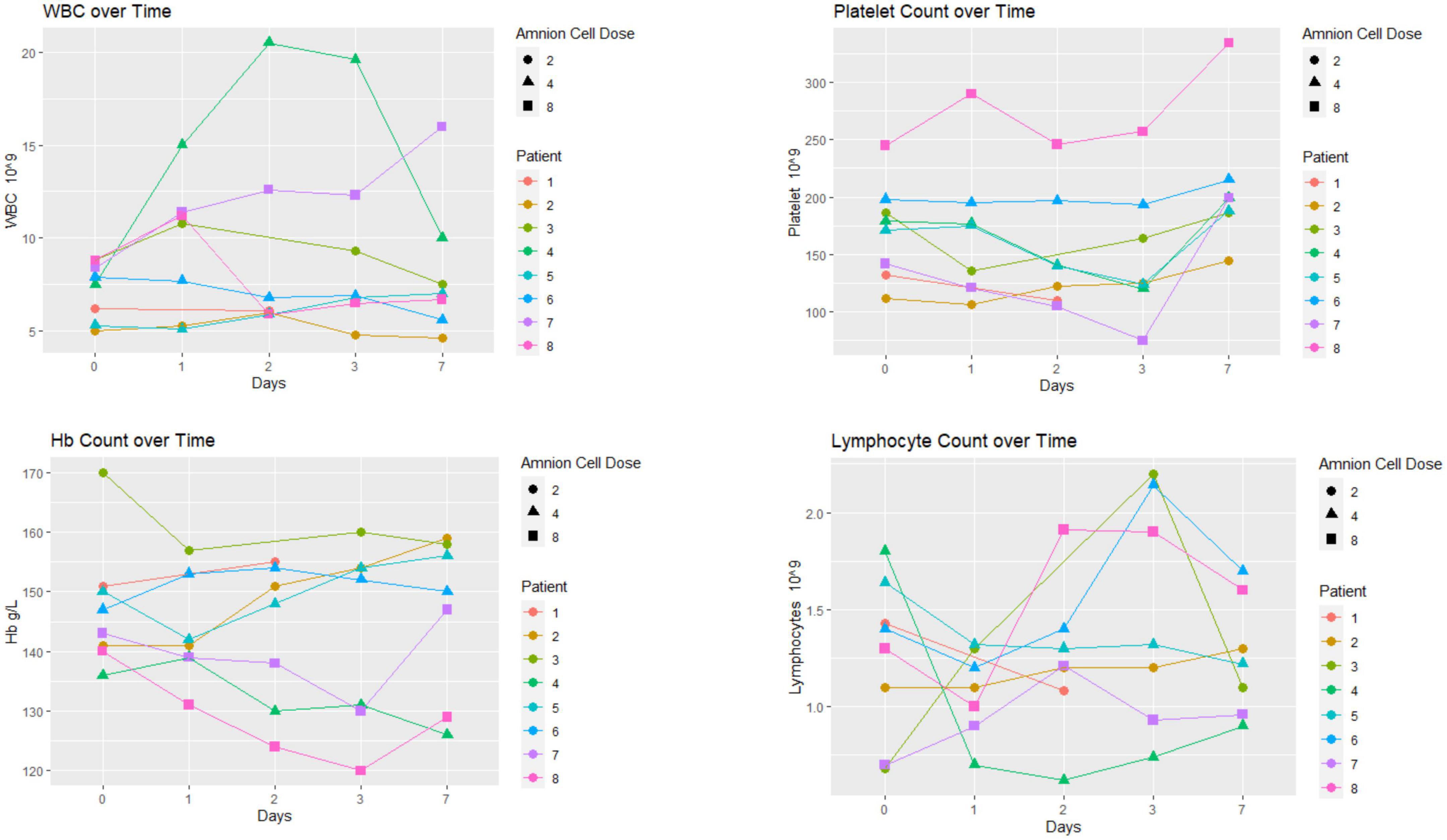 血液學(xué)變化如圖2所示。在這8名患者中沒(méi)有觀察到特殊的模式。4名患者白細(xì)胞 (WBC) 升高至10×10^9/L以上。這四名患者中有兩名的白細(xì)胞升高是暫時(shí)的。這些患者的胸部X光檢查、血液和尿液培養(yǎng)均正常。血紅蛋白譜未降至120g/L以下。患者7的血小板計(jì)數(shù)在第3天降至100×10^9/L以下,然后在第7天恢復(fù)正常。結(jié)果顯示患者4出現(xiàn)短暫性淋巴細(xì)胞減少(低于1×10^9/L)。嗜酸性粒細(xì)胞計(jì)數(shù)為0.10±0.10×基線時(shí)為10^9/L(平均值±標(biāo)準(zhǔn)差),細(xì)胞輸注后5-7天仍保持在正常范圍內(nèi) (0.15±0.10×10^9/L,n=8;數(shù)據(jù)未顯示)。