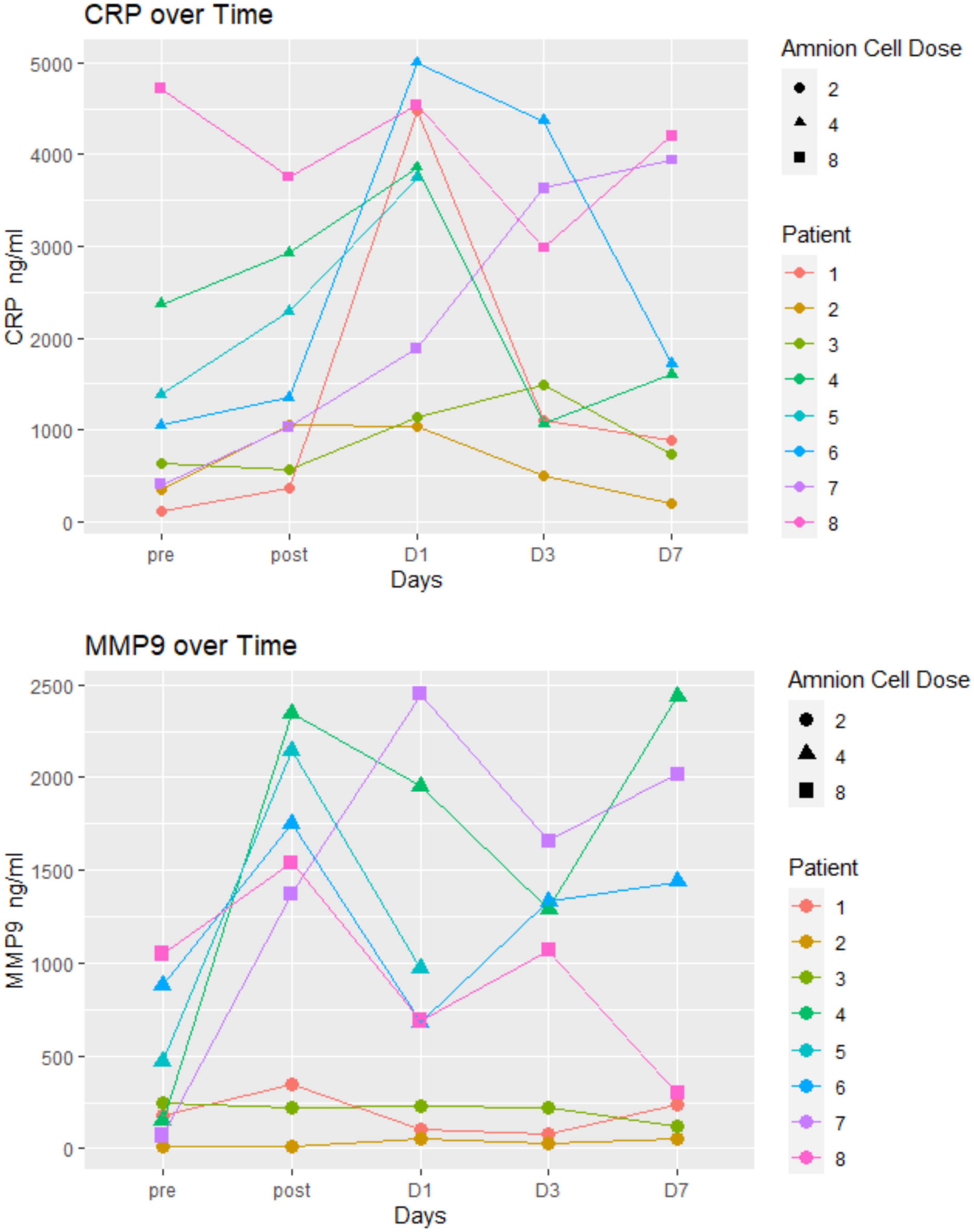 免疫學(xué)變化如圖3、4所示。在這8名患者中沒(méi)有觀察到特殊的模式。簡(jiǎn)而言之,結(jié)果沒(méi)有顯示出明顯的趨勢(shì),特別是在hAEC的效果方面(例如,接受最高劑量的患者7和8與接受最低劑量的患者1-3之間)。我們無(wú)法檢測(cè)(或檢測(cè)到低水平)幾種炎癥標(biāo)志物(IFN-γ、IL-6、TNF、IL-10和IL-17)。高敏CRP和MMP-9水平保持在正常范圍內(nèi)。在三名患者(患者1-3)中,MMP-9水平在第一周內(nèi)沒(méi)有變化。