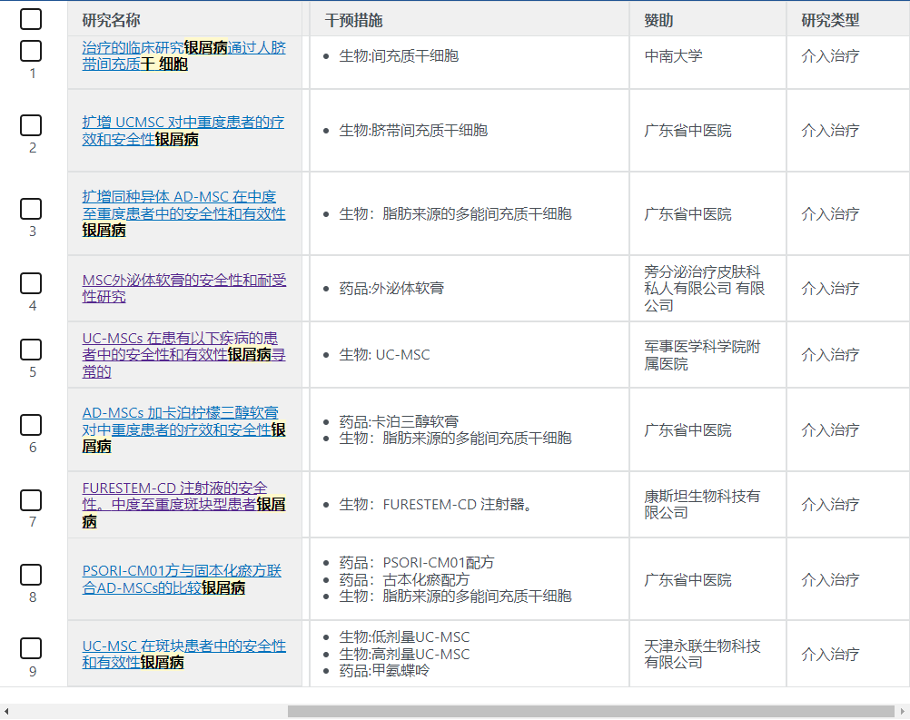 截止2023年8月,在美國國立衛(wèi)生研究院的最大臨床試驗注冊庫clinicaltrials.gov網(wǎng)站上注冊的有關(guān)干細胞治療銀屑病的臨床研究項目有9項。其中在國內(nèi)的臨床研究有7項。