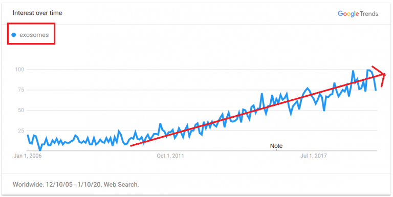 目前已發(fā)表了至少26,805 篇有關(guān)外泌體的科學(xué)文章,并且正在進(jìn)行301項臨床試驗,這些小囊泡在一系列治療應(yīng)用中具有令人著迷的潛力。過去10年,“外泌體”一詞已成為Google上越來越常見的搜索詞,如下圖所示: