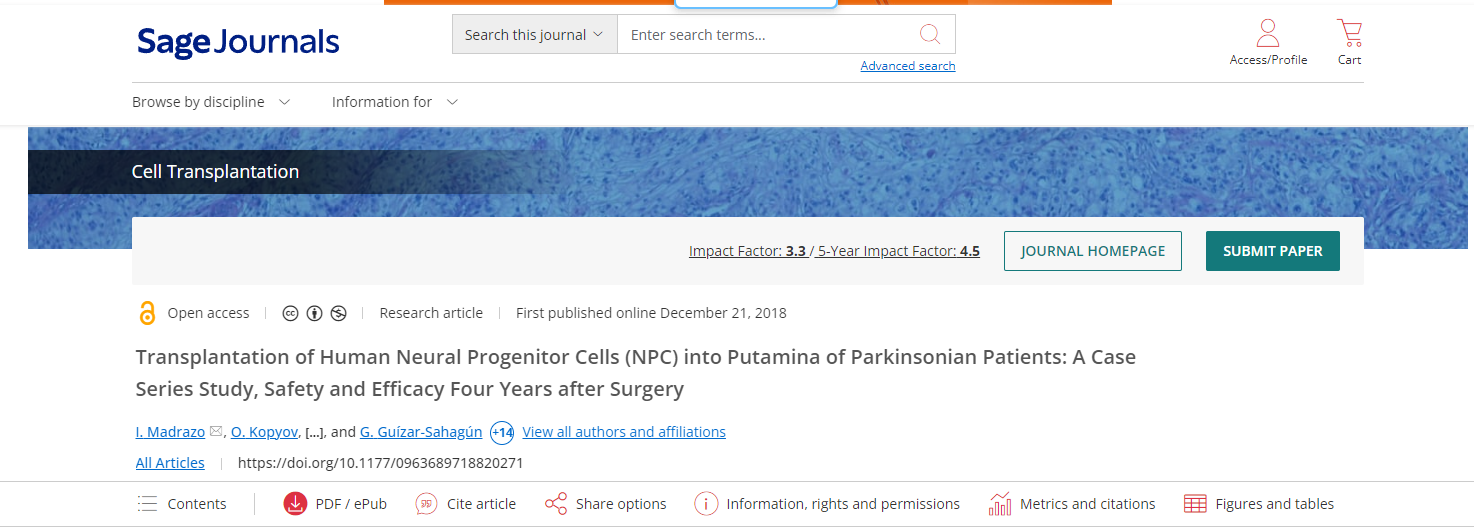 2019年,墨西哥總醫(yī)院在8名中度PD患者中測試了人類神經祖細胞 (NPC)。該文獻發(fā)表在《細胞移植》期刊上,研究人員使用現(xiàn)代手術,將NPC懸浮液注射到患者的雙側殼核中。細胞移植一年后,患者表現(xiàn)出不同程度的運動改善,其中五名患者對藥物表現(xiàn)出更好的反應。中腦的多巴胺能活性增加。經過4年的治療,進展略有下降,但仍然好于最初。還注意到殼核背側多巴胺能神經傳遞的增加,這可能與運動功能的改善相關。