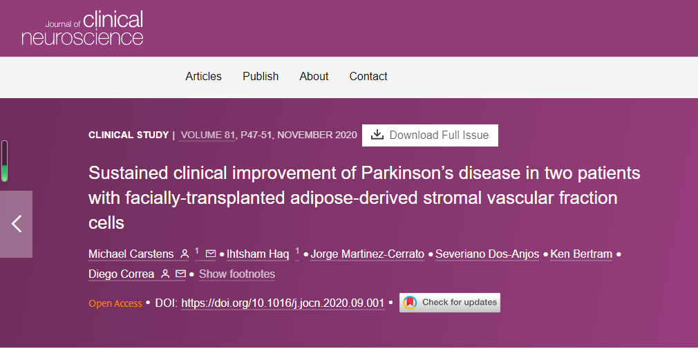 2020年維克森林大學再生醫(yī)學研究所,兩名PD患者接受了自體脂肪源性血管基質成分 (SVF) 治療。它們被直接給予面部和鼻子的肌肉。SVF后,兩名患者的運動表現(xiàn)均有所改善,且多巴胺能治療水平較低。盡管作用機制未知,但這種潛在的療法需要進一步研究。