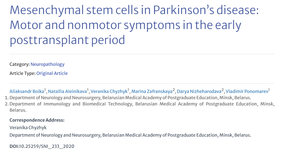 2021年,白俄羅斯研究生教育醫(yī)學院神經內科和神經外科完成了一項I期臨床試驗[NCT03550183],研究人員通過靜脈輸注使用臍帶間充質干細胞(UC-MSC)來治療PD。通過不同持續(xù)時間的隨訪,研究人員測試了治療效果和生活質量。