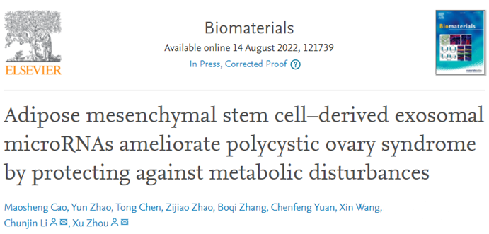 2022年8月14日,吉林大學(xué)周虛教授、李純錦教授團(tuán)隊(duì)在國(guó)際權(quán)威雜志Biomaterials上發(fā)表題為“Adipose mesenchymal stem cell-derived exosomal microRNAs ameliorate polycystic ovary syndrome by protecting against metabolic disturbances”的研究論文(2022, 14:121739),闡述了脂肪間充質(zhì)干細(xì)胞外泌體通過(guò)防止代謝紊亂改善多囊卵巢綜合征的機(jī)制。